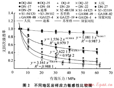2) 低滲透儲(chǔ)層巖石在實(shí)驗(yàn)分析中均表現(xiàn)出應(yīng)力敏感特征,不同地區(qū)和不同巖石類型具有差異性,在實(shí)際生產(chǎn)中的儲(chǔ)層應(yīng)力敏感性表現(xiàn)形式及其對(duì)開發(fā)的影響還需要深入研究。