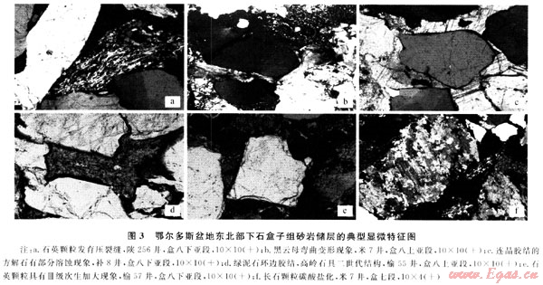 指松散沉積物在上覆水體和沉積物負(fù)荷壓力作用下發(fā)生總體積縮小和孔隙度降低的一種成巖作用方式,是儲層形成過程中一種主要的破壞性成巖作用。鄂爾多斯盆地東北部下石盒子組砂巖儲層的埋藏深度大,機(jī)械壓實(shí)作用強(qiáng),埋藏史模擬得出的最大古埋深介于3000~4100m之間(早白堊世末)[7],當(dāng)前埋藏深度介于2000~3300m之間。顯微鏡下砂巖呈顆粒支撐,顆粒間以線接觸為主,部分呈點(diǎn)-線接觸或凹凸?fàn)罱佑|;石英或巖屑等剛性碎屑發(fā)育壓實(shí)作用形成的脆性微裂紋和壓溶現(xiàn)象(圖3-a);云母碎屑、千枚巖、泥巖巖屑等塑性顆粒被壓實(shí)變形(圖3-b),甚至呈假雜基充填顆粒間。這些現(xiàn)象表明砂巖儲層經(jīng)歷了較強(qiáng)的壓實(shí)作用。強(qiáng)烈的壓實(shí)作用不但喪失了大部分的原生孔隙,也不利于次生孔隙孔隙的保存,是研究區(qū)砂巖儲層致密化的一個重要因素。