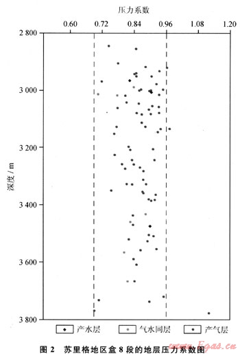 盒8段的原始地層壓力在22.5~42.5MPa。地層壓力總體上隨深度增加而呈線性升高,但地層壓力系數(shù)在縱向上缺乏明顯規(guī)律性。在2800~3800m的范圍內(nèi),無論是水層、氣層還是氣水同產(chǎn)層,地層壓力系數(shù)隨深度增加的變化都比較分散(圖2)。這表明區(qū)內(nèi)異常低壓的分布不受埋深控制,而且與儲層孔隙流體相態(tài)之間也無直接聯(lián)系。