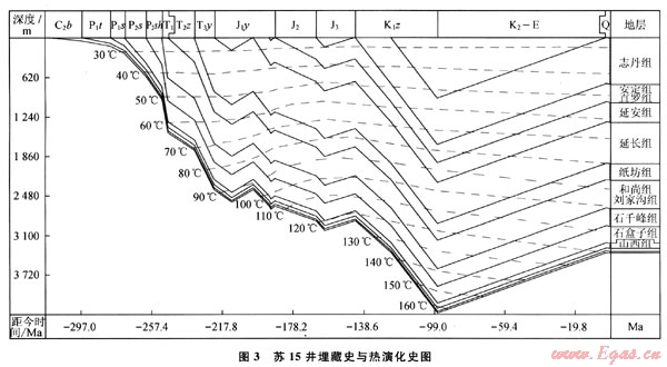 蘇里格地區(qū)在燕山中晚期由于構(gòu)造熱事件的發(fā)生,古地溫梯度較高,介于3.6~4.0℃/100m,早白堊世末以來,燕山構(gòu)造熱事件消失,地溫梯度下降為現(xiàn)今的2.8~3.0℃/100m。晚白堊世以來,一方面地溫梯度逐漸降低,另一方面,地層抬升和剝蝕又進(jìn)一步使地層溫度降低。通過盆地模擬計(jì)算,蘇里格氣田盒8段從早白堊世末期到現(xiàn)今,由最高古地層溫度從170℃降低到110~120℃,地層溫度大約平均降低了50℃(圖3)。假設(shè)氣藏自早白堊世末至今不存在氣體的散失和注入,根據(jù)理想氣體熱力學(xué)方程計(jì)算,地層壓力降低到原來的86.5%。