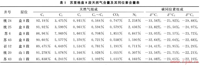 具體證據(jù)為:①盒8段與下伏烴源巖發(fā)育的山西-本溪組的氣層壓力仍基本相似,均屬于異常低壓;②盒8段儲層含氣飽和度與地層壓力系數(shù)的關(guān)系也不明顯;③該區(qū)內(nèi)盒8段天然氣組成和碳同位素與下伏山西組基本相似(表1)。