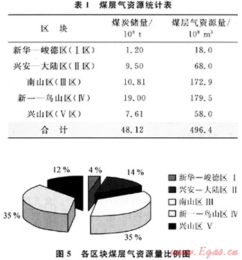 鶴崗礦區(qū)煤炭資源豐富,主要分布于1500m以淺。筆者以垂深1500m為界線(xiàn),將鶴崗礦區(qū)劃分為5個(gè)區(qū)塊,分別對(duì)其煤層氣資源量進(jìn)行預(yù)測(cè):煤炭?jī)?chǔ)量共有48.12×104t,含氣量為7~16m3/t,預(yù)測(cè)煤層氣資源量為496.4×108m3(表1)。其中南山區(qū)(Ⅲ區(qū))和新一-鳥(niǎo)山區(qū)(Ⅳ區(qū))為主要含氣區(qū),資源量分別為172.9×108m3和179.5×108m3,占1500m以淺煤層氣總資源量的70%(圖5)[5]。