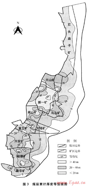 對(duì)125口井的煤層累計(jì)厚度進(jìn)行了統(tǒng)計(jì),煤層累計(jì)厚度為30~70m。從全區(qū)煤層發(fā)育情況來(lái)看,橫向上煤層連續(xù)性較好,但厚度上具有多個(gè)聚煤中心,其中大于40m的主要分布在新一、南山礦(分布面積為24.2km2)和興安、峻德礦的局部地區(qū)(分布面積為5.5km2);石頭廟子礦區(qū)煤層發(fā)育較差,厚度一般小于10m(圖3)。在南山、新一礦煤層厚度較大,直接決定了煤層氣生成及吸附能力較其他礦區(qū)強(qiáng),導(dǎo)致瓦斯涌出量相對(duì)偏高。