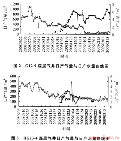 由于壓實(shí)作用,該部位裂隙不發(fā)育,其儲(chǔ)層中水的流動(dòng)類似于地下水流動(dòng)的“排泄區(qū)”。在排水采氣過程中,接受來自翼部?jī)?chǔ)層中水的補(bǔ)給,因其處于“排泄區(qū)”,儲(chǔ)層中水匯集于此,排水強(qiáng)度最大,產(chǎn)水量很大,壓降漏斗卻很小[6~8]。因此,向斜部位的煤儲(chǔ)層盡管含氣量相對(duì)較高,但連通性較差,煤層氣井穩(wěn)定產(chǎn)氣量一般不高,多在800~1200m3/a,產(chǎn)水量較大。樊莊區(qū)塊內(nèi)HG24-3、HG23-4井等煤層氣井位于向斜核部位置,產(chǎn)氣量低且不穩(wěn)定;HG23-4井產(chǎn)水量相對(duì)較大,排采近200d后,產(chǎn)水量約1.7m3/a(圖3)。