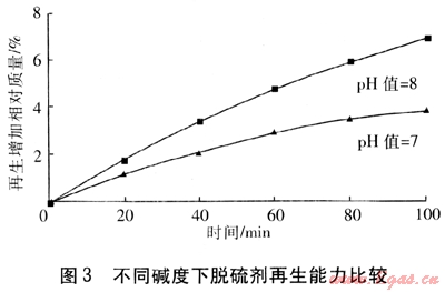 由此可見,脫硫劑pH值=7時(shí),再生速度較慢,時(shí)間超過80min后,再生基本停止;當(dāng)pH值=8時(shí),再生速度大大加快,并能持續(xù)進(jìn)行。因此,保持脫硫劑的堿度不僅是脫硫的需要,也是提高脫硫劑再生速度的需要。
