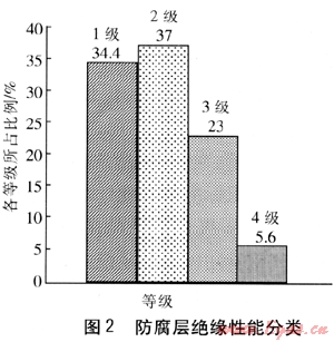 對鋼管防腐層絕緣性能檢測采用變頻選頻法,儀器采用Bs508多功能型絕緣電阻測量儀,共測量106處。根據(jù)檢測結(jié)果,防腐層絕緣性能按照絕緣層電阻分類,見圖2。為了準(zhǔn)確確定埋地管道防腐層的破損點,采用交流電位梯度法(皮爾遜法)[1~2]進行防腐層破損點檢測和定位,共檢測和定位56處破損點。按照破損點的大小分類,大破損點2處,中破損點22處,小破損點32處。