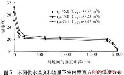在不同供水溫度和流量下,室內(nèi)垂直方向溫度分布見圖5。由圖5可知:①隨著高度的增加,空氣溫度迅速降低,在距地面200mm處溫度基本達(dá)到穩(wěn)定,而在距地面1800mm以上溫度迅速降低。②隨著供水流量的增大與供水溫度的升高,各測(cè)點(diǎn)溫度也相應(yīng)升高,且在地面附近溫度差異明顯,在頂棚附近溫度沒有明顯變化。這種現(xiàn)象反映r熱管地板輻射采暖與普通地板輻射采暖的特點(diǎn)一致,即室內(nèi)空氣垂直方向溫度梯度小。