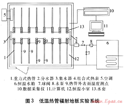 碳鋼/水重力式熱管(又稱碳鋼/水兩相閉式熱虹吸管)具有結(jié)構(gòu)簡(jiǎn)單、成本低廉、傳熱性能優(yōu)良、工作可靠等特點(diǎn),在冶金、化工、建材、動(dòng)力等行業(yè)有很多成功的應(yīng)用實(shí)例[1]。隨著熱管技術(shù)的不斷成熟,其在建筑行業(yè)的應(yīng)用引起了學(xué)者們的關(guān)注。JEBRAIL等制作了熱管散熱器并測(cè)試了其熱工性能[2],國(guó)內(nèi)學(xué)者蔣愛華等對(duì)熱管輻射墻壁進(jìn)行了探討[3],羅清海等分析了不同工質(zhì)熱管散熱器的熱工性能[4]。本文擬將碳鋼/水重力式熱管與地板輻射采暖系統(tǒng)結(jié)合起來(lái),以期利用其優(yōu)良的傳熱性能,在提供舒適熱環(huán)境的同時(shí),達(dá)到降低供水溫度、減小熱水循環(huán)流量、提高系統(tǒng)整體運(yùn)行效率和經(jīng)濟(jì)性的目的。本文在重力式熱管和串聯(lián)熱管傳熱性能研究的基礎(chǔ)上[5],對(duì)低溫?zé)峁茌椛涞匕宓臒峁ば阅苓M(jìn)行實(shí)驗(yàn)研究。