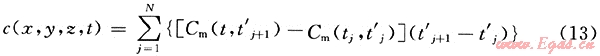 令t1=0,tN=t’,當(dāng)時(shí)間較短時(shí),取N=1000足可以滿足工程計(jì)算精度需求。則對(duì)任意時(shí)刻任意點(diǎn)處的濃度計(jì)算式為: