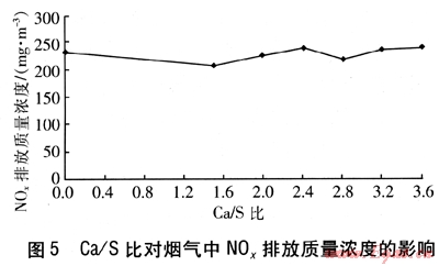 ⑤ 爐內(nèi)脫硫?qū)0x排放質(zhì)量濃度的影響煙氣中N0x排放質(zhì)量濃度隨Ca/S比的變化情況見圖5。