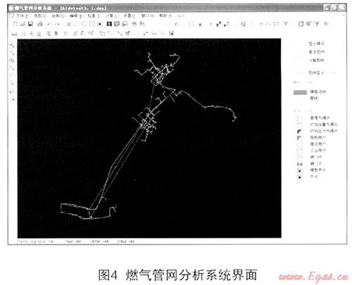 燃氣管網分析系統(tǒng)是采用AutoCAD控件組態(tài)成人機交互平臺,在圖形操作上更加方便、靈活。其主要功能如下: