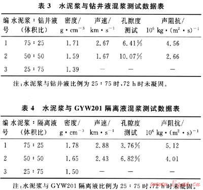 2) 在相同比例時(shí),水泥漿與GYW201隔離液混漿的聲阻抗數(shù)據(jù)均大于水泥漿與鉆井液混漿,其抗壓強(qiáng)度也大于水泥漿與鉆井液混漿。無論常規(guī)密度水泥漿與鉆井液漿或GYW201隔離液以什么樣的體積比例混合,其混合后聲阻抗數(shù)據(jù)、強(qiáng)度數(shù)據(jù)均與水泥漿體積含量成正比,而初終凝時(shí)間與水泥漿體積含量成反比。