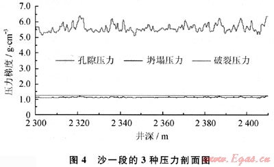 要在九龍山構(gòu)造安全開展欠平衡鉆井,前提是必須滿足井壁穩(wěn)定條件。測井資料表明,沙一段至珍珠沖組井段多含有泥巖段。因此,有必要采用泥頁巖水化模型分析坍塌壓力剖面。為此,本文利用測井資料,采用加拿大STAB-WELL欠平衡鉆井井壁穩(wěn)定分析軟件對不同層位進行井壁穩(wěn)定計算。圖4是沙一段的3種壓力剖面。從圖4中可以看出,該段破裂壓力高,孔隙壓力梯度為1.254g/cm3,最高坍塌壓力梯度為1.094g/cm3,欠平衡設(shè)計的鉆井液密度必須要高于最低坍塌壓力梯度,設(shè)計的范圍為1.10~1.25g/cm3。圖5是千佛巖組層段的3種壓力剖面,計算結(jié)果表明,該段最高坍塌壓力梯度為1.10g/cm3,欠平衡設(shè)計的鉆井液密度必須高于最低坍塌壓力梯度,設(shè)計的范圍為1.10~1.25g/cm3。