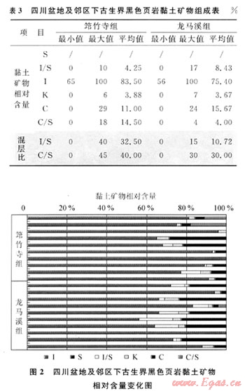 Bowker研究認(rèn)為,Barnett頁巖層中黏土礦物主要為微含蒙皂石的伊利石[10]。四川盆地及鄰區(qū)筇竹寺組和龍馬溪組頁巖儲層黏土礦物分析結(jié)果也表明其組成主要是伊利石,其次為綠泥石,不含蒙皂石,有少量的高嶺石和伊/蒙混層(表3、圖2)。筇竹寺組的伊利石含量較龍馬溪組高,平均值為83.5%,I/S混層比在0~40%,平均為32.5%;龍馬溪組的綠泥石平均含量為15.67%,I/S混層比平均為10.72%。