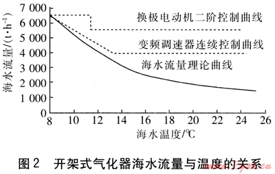 開架式氣化器海水流量與溫度的關(guān)系見圖2[6]。圖2中,實(shí)線表示在LNG參數(shù)及氣化器參數(shù)一定的條件下,海水溫度與實(shí)現(xiàn)氣化所需的海水流量之間的關(guān)系,隨著海水溫度的升高,所需的海水流量減小。上下兩條虛線分別表示采用換極電動(dòng)機(jī)或變頻調(diào)速器根據(jù)海水溫度來實(shí)現(xiàn)流量調(diào)節(jié)的曲線。