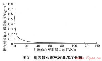 編程計(jì)算的燃?xì)馍淞鬏S心質(zhì)量濃度分布見(jiàn)圖3。當(dāng)射流軸心至泄漏口的距離約為9.9m時(shí),含量達(dá)到爆炸上限(15%),當(dāng)射流軸心至泄漏口的距離約為30.6m時(shí),含量低于爆炸下限(5%)。當(dāng)射流軸心至泄漏口的距離為154m時(shí),含量低于燃?xì)獾木潴w積分?jǐn)?shù)(1%)。