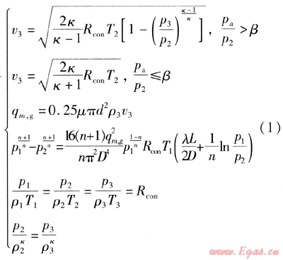 假設(shè)燃?xì)鈴狞c(diǎn)1流至點(diǎn)2為管內(nèi)多變流動(dòng)過(guò)程,從點(diǎn)2泄漏到點(diǎn)3為等熵流動(dòng)過(guò)程,推導(dǎo)得到點(diǎn)3處燃?xì)獾臏囟?、壓力、流速、密度和質(zhì)量流量[2],見(jiàn)式(1)。