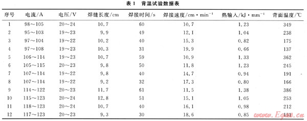 研究管道背溫,有利于計(jì)算管道壁厚一定時(shí)的焊接壓力。如焊接溫度過(guò)高,相應(yīng)溫度下管道材料的屈服極限數(shù)值降低,熔池下未融的面積不能承受管道內(nèi)壓,導(dǎo)致燒穿管道。一般墊層焊接電流控制在100~120A之間,背溫試驗(yàn)的材質(zhì)為X65,管道規(guī)格為Φ610mm×12.7mm。