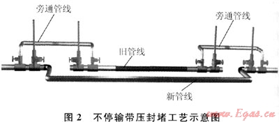 由于停氣實(shí)施新老管線對(duì)接對(duì)下游用戶影響較大,建設(shè)單位要求該段管線采用不停輸方式進(jìn)行封堵連頭。由于改造段管線兩側(cè)封堵施工點(diǎn)距離長(zhǎng)達(dá)700m,敷設(shè)長(zhǎng)距離旁通管既不經(jīng)濟(jì)又費(fèi)時(shí)間。因此決定采用在舊管線兩端對(duì)接點(diǎn)分別架設(shè)旁通的帶壓封堵工藝,其工藝示意圖如圖2所示。此工藝的優(yōu)點(diǎn)在于無(wú)須架設(shè)長(zhǎng)距離旁通管道,所有工序均在不影響管線內(nèi)高壓介質(zhì)正常輸送的狀態(tài)下進(jìn)行,安全可靠[1]。