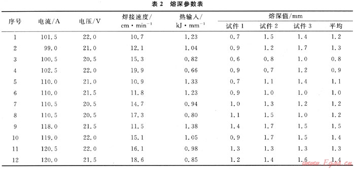 試驗(yàn)步驟:試件放置在水平位置,分別調(diào)節(jié)電流到100A、110A、120A進(jìn)行焊接。將焊接試件剖開(kāi),表面進(jìn)行加工后,磨制成金相試件,然后拋光、腐蝕,測(cè)定最大熔深和平均熔深,數(shù)據(jù)見(jiàn)表2。