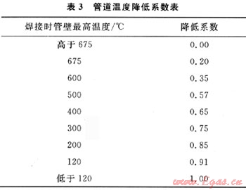 管道溫度降低系數(shù)見(jiàn)表3(適用于管道最大承載壓力)。