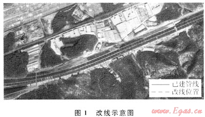 深圳市擬建的地鐵5號(hào)線塘朗段與平南鐵路用地沖突,平南鐵路須向南平移。但鐵路平移將與廣東LNG塘朗段管道發(fā)生沖突,為保證LNG管道的安全運(yùn)行、周邊在建各項(xiàng)目的正常施工及建成后的安全,深圳市政府及有關(guān)方面要求對(duì)該段管道進(jìn)行遷移。該段管線為廣東LNG支干線的一部分,主要向深圳工業(yè)及民用用戶供氣,已于2006年竣工并投運(yùn)。管道設(shè)計(jì)壓力為9.2MPa,規(guī)格為Φ610mm×12.7mm,材質(zhì)為X65鋼,需改線遷移的管道長(zhǎng)720m。鑒于經(jīng)濟(jì)和社會(huì)影響,改線管道建成后,需與舊管線實(shí)施不停輸帶壓對(duì)接。改線示意圖見(jiàn)圖1。