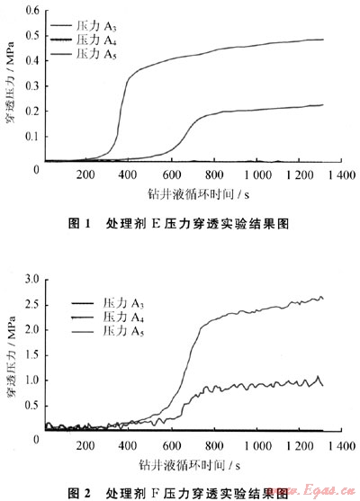 實(shí)驗(yàn)采用處理劑E、F對(duì)同一深度的井下巖心進(jìn)行了壓力穿透測試,結(jié)果見圖1、2。