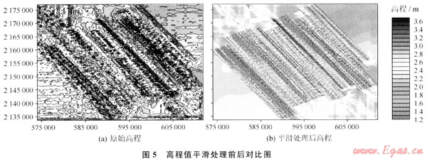 在室內(nèi)處理中使用SkyFix XP定位系統(tǒng)測量地震采集過程中地震船實時的大地高程,然后通過高程轉(zhuǎn)換,計算出地震采集過程中實時的潮汐值。利用SkyFix XP高程進(jìn)行潮汐校正,需要進(jìn)行高程值平滑處理,消除各種偶然誤差帶來的對高程的跳變影響。從圖5中可以看出各航行線之間高程的明顯變化,同時也反映了由于潮汐變化使地震采集不是在一個固定平面上進(jìn)行的事實。