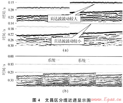 除了海底的問題外,近遠(yuǎn)纜的空間分布的位置及地下介質(zhì)的吸收系數(shù)、反射系數(shù)不同,會使得不同電纜接受的反射信號存在著差異。所以認(rèn)為,近遠(yuǎn)纜接受信號的差異是海上地震資料采集腳印嚴(yán)重的重要原因之一。在文昌區(qū)某些早期采集的地震數(shù)據(jù)中,不同線之間的采集質(zhì)量差異較大(圖4-b)。從直達(dá)波可以看出圖4-a上中直達(dá)波波動較大,說明采集時所受外界影響大,質(zhì)量較差;而圖4-a下中直達(dá)波波動較小,說明采集時所受外界影響小,質(zhì)量較好。特別在文昌區(qū)中地震數(shù)據(jù)采集時有兩個記錄系統(tǒng),兩個系統(tǒng)之間的不穩(wěn)定帶來采集腳印的影響非常嚴(yán)重,系統(tǒng)二采集質(zhì)量較好,系統(tǒng)一遠(yuǎn)纜采集質(zhì)量較差。以上原因也是導(dǎo)致該工區(qū)的采集腳印非常嚴(yán)重的另一個原因。