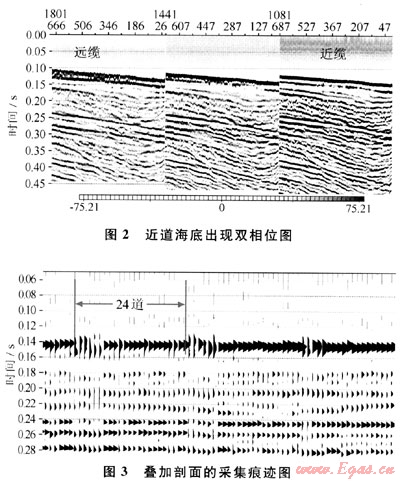 在海上三維采集中,由于海上拖纜特殊的采集方式,觀測系統(tǒng)因素除了陸上采集的觀測系統(tǒng)因素(激發(fā)和接收線距、寬方位和窄方位、覆蓋次數(shù)、方位角、炮檢距和源致線性干擾)外,還有因震源、電纜檢波點位置都處于相對運動狀態(tài)而帶來的其獨特影響。非觀測系統(tǒng)因素則包括了潮汐、水溫、含鹽度、水流方向、洋流、風(fēng)力、采集工區(qū)的水深、氣槍容量、氣槍壓力的變化、工區(qū)的地質(zhì)條件以及出于經(jīng)濟方面的考慮海上拖纜采集以轉(zhuǎn)圈的采集方式等多方面的影響。在對文昌區(qū)數(shù)據(jù)進(jìn)行檢查與分析時,通過逐纜抽取地震數(shù)據(jù)近道檢查可以看到,通常遠(yuǎn)纜采集質(zhì)量較差,而且接收到的能量與近纜是有差異的。局部區(qū)域在遠(yuǎn)纜近道顯示上的海底甚至出現(xiàn)雙相位(圖2),造成疊加數(shù)據(jù)體每隔24道(與處理面元有關(guān))海底成像不好出現(xiàn)嚴(yán)重的采集痕跡(圖3)。經(jīng)分析,這種現(xiàn)象受水深及采集時的最小偏移距的共同影響,在水深100m左右的工區(qū)中這種遠(yuǎn)纜出現(xiàn)雙相位的現(xiàn)象特別明顯,而水深超過120m后遠(yuǎn)纜出現(xiàn)雙相位的情況就沒有那么明顯了,在水深小于50m時,地震數(shù)據(jù)體的海底基本上不成像。