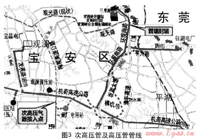 該方案將西氣東輸二線到來后將使用的天然氣高壓管線與目前的次高壓天然氣管線結(jié)合,利用該段已建好的高壓管線與次高壓管線連接,通過次高壓管網(wǎng)供應(yīng)電廠。管線情況見圖3。
