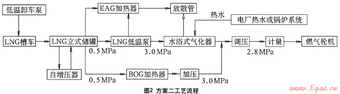 如果將明火水浴式氣化器改用水浴式氣化器,氣化器用熱水由電廠或者自建鍋爐系統(tǒng)提供,可以節(jié)省投資1089×104元。工藝流程詳見如下圖2。