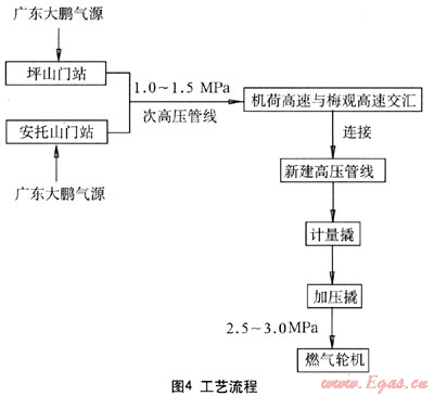 該方案只需煙廠專用調(diào)壓站后的次高壓管線與機(jī)荷高速、坂雪大道、環(huán)觀南路、平大路的高壓管線聯(lián)通,目前只需建設(shè)6.42km,即可聯(lián)通,從工期上來說,應(yīng)可以滿足需求。電廠內(nèi)需建設(shè)計(jì)量撬、加壓撬,工藝流程見圖4。