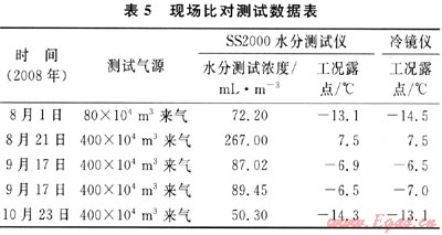 從實(shí)驗(yàn)數(shù)據(jù)可以看出,儀器重復(fù)性滿足說明書技術(shù)指標(biāo)要求,相對標(biāo)準(zhǔn)偏差較小,儀器的測量精度未受到天然氣中各種雜質(zhì)的影響,運(yùn)行可靠,能滿足現(xiàn)場在線測試的要求。在B站現(xiàn)場儀器與冷鏡法的比對數(shù)據(jù)見表5。