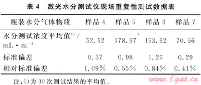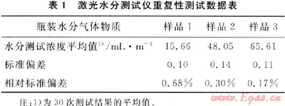 重復(fù)性是儀器的重要技術(shù)指標(biāo),直接影響分析結(jié)果的不確定度。在實(shí)驗(yàn)室對儀器的重復(fù)性進(jìn)行了考察。測試對象為中國測試技術(shù)研究院制備的3瓶瓶裝水分氣體物質(zhì)(補(bǔ)充氣為氮?dú)?,用SS2000激光水分測試儀對每瓶氣體進(jìn)行了連續(xù)1h的測試,測試結(jié)果見表1。