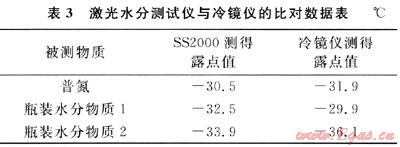 天然氣水分測試常用的測試技術(shù)有冷鏡法、電解法、Al2O3電容法和石英晶體法等[5]。在實(shí)驗(yàn)室對SS2000激光水分測試法與冷鏡法進(jìn)行了比對(冷鏡儀由中國測試技術(shù)研究院進(jìn)行檢定),被測物質(zhì)分別為普氮和瓶裝水分物質(zhì)(補(bǔ)充氣為甲烷),濃度值與露點(diǎn)值之間的轉(zhuǎn)換采用ASTM1142標(biāo)準(zhǔn),比對結(jié)果見表3。