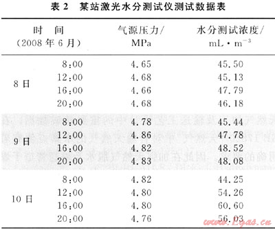 SS2 000激光水分測試儀在某輸氣站運(yùn)行了4個月,對站場進(jìn)氣進(jìn)行實(shí)時監(jiān)測,于每天8:00、12:O0、16:00和20:O0分別記錄儀器的測試數(shù)據(jù),2008年6月8~10日的測試結(jié)果見表2。
