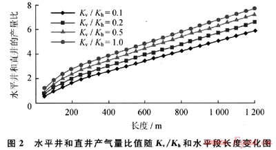 根據(jù)現(xiàn)代油藏工程計算,某凝析氣藏水平井和直井采氣量比值隨Kv/Kh值和水平段長度的變化而變化(圖2)。當Kv/Kh值為0.2、0.5和水平段長度為500m的條件下,水平井和直井產氣量比值分別為3.6和4.2。由此可見滲透率非均質影響水平井的增產效果。