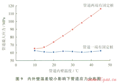 在不同輸氣溫度影響下,模擬管道內(nèi)外壁溫差接近時應力分布特征,取內(nèi)壓為10MPa,內(nèi)壁溫度為l0~45℃,外壁溫度保持接近,溫差為2~5℃。建立兩端有固定墩和一端有固定墩兩類管道模型,計算結(jié)果如圖9所示。