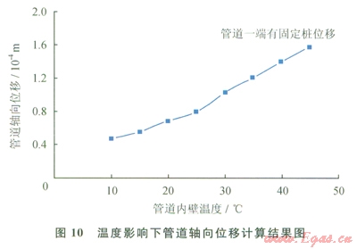 由計算結(jié)果可知,相對于管道一端有固定墩約束,管道兩端有固定墩約束時產(chǎn)生的應力較大。在內(nèi)外壁溫差較小時,隨著輸氣溫度的增加,管道一端有固定墩時產(chǎn)生的熱應力趨于水平,由此可知溫度對管道應力影響較小,這是因為軸向伸長得到補償從而減小了管道產(chǎn)生的集中應力。在內(nèi)外壁溫差保持不變時,管道應力不發(fā)生較大變化。在內(nèi)外壁溫差較小時,管道兩端有固定墩約束情況下管道最大應力隨輸氣溫度的增加而明顯增加,遠大于管道一端有固定墩約束時產(chǎn)生的應力。管道內(nèi)輸氣壓力的增加造成管道應力增加。在溫度影響下管道一端有固定墩約束時軸向位移計算結(jié)果如圖l0所示。