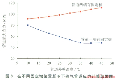 由計算結(jié)果分析,管道上下兩端有固定墩約束時較管道一端有固定墩約束事產(chǎn)生了較大應力。兩端有固定墩約束時,管道應力隨著內(nèi)外壁溫差的減小而增大。這是由于溫度增加造成管道內(nèi)等效熱應力增加。由于兩端固定,輸氣管道在軸向上不能得以伸長,應力得不到有效釋放,因此,管道為克服熱脹冷縮效應及位移約束而產(chǎn)生了較大不均勻分布的應力。管道一端固定,應力隨著溫差的減小而減小,這是由于溫差減小,管道不均勻分布的應力隨著軸向的伸長變形得以釋放而減小。由此可知,為減小管道應力,設置固定墩時,間距應增大,并且保持在一定的范圍內(nèi),既能減小軸向變形又能滿足應力釋放,從而減小管道應力大小。