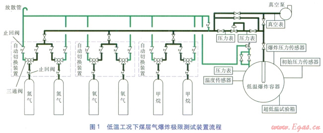 低溫工況下煤層氣爆炸極限的測(cè)試裝置流程按功能分為吹掃流程及引爆試驗(yàn)流程。吹掃流程:在進(jìn)行試驗(yàn)之前必須對(duì)管道進(jìn)行吹掃,即打開(kāi)氮?dú)鈿馄砍隹陂y門,用氮?dú)獯祾哒麄€(gè)回路,由放散管集中排放。引爆試驗(yàn)流程:關(guān)閉氮?dú)鈿馄砍隹陂y門,啟動(dòng)真空泵將低溫爆炸容器抽至-0.02MPa;關(guān)閉真空泵,依次打開(kāi)氮?dú)狻⒀鯕?、甲烷氣瓶,按比例充入到低溫爆炸容器?nèi);待各組分充分混合均勻后利用超低溫試驗(yàn)箱降溫,進(jìn)行引爆試驗(yàn)。低溫工況下煤層氣爆炸極限測(cè)試裝置流程見(jiàn)圖l。