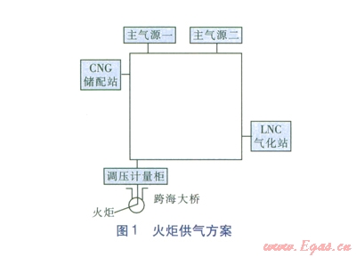 海陽市地處黃海之濱、山東半島的中南部、膠東半島南翼,南臨黃海,北接半島內(nèi)陸,位于煙臺、青島、威海三個開放窗口城市中心地帶,有“東方夏威夷”的美譽,2012年第三屆亞洲沙灘運動會(以下簡稱亞沙會)便在海陽市旅游度假區(qū)舉行。該地區(qū)天然氣的開發(fā)和經(jīng)營權(quán)屬我公司,給亞沙會火炬供氣即成為必然。根據(jù)公司管網(wǎng)現(xiàn)狀、氣源情況、火炬臺現(xiàn)場及亞沙會火炬設計方所提供的技術(shù)參數(shù)及其他綜合因素,提出火炬供氣方案,見圖l。