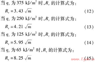 將已知參數(shù)代入式(12)~(15),可計(jì)算得到不同火球入射熱輻射劑量下的火球熱輻射半徑(見表4)。