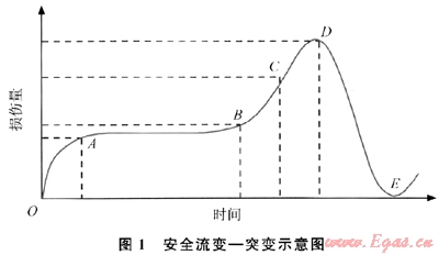假設(shè)將事物的危險狀態(tài)用損傷程度來表示,那么事物的“安全流變-突變”的全過程可以表述為(如圖1):當(dāng)某一事物誕生后的初期(OA階段),其損傷量在外界力的作用下呈減速遞增,新的狀態(tài)在此期間逐漸形成和完善。當(dāng)新的狀態(tài)發(fā)展到成熟階段時(AB階段),完善的新狀態(tài)使損傷量勻速緩慢增加。當(dāng)經(jīng)過一段穩(wěn)定增加后,原狀態(tài)將再次向無序方向發(fā)展,進(jìn)而使損傷量值開始加速增大(BC段)。任何事物都有其固有的損傷量承受能力或臨界點(D點),超出此臨界點(D點)后,事物將發(fā)生安全突變。當(dāng)事物的原狀態(tài)遭到破壞后,事物又重新回到一個新的安全狀態(tài),原事物的狀態(tài)消失,從而又形成了另一個同類新事物誕生的新起點(E點)。物質(zhì)世界就是在這種安全與危險的無限循環(huán)中得以存在和發(fā)展的[4]。