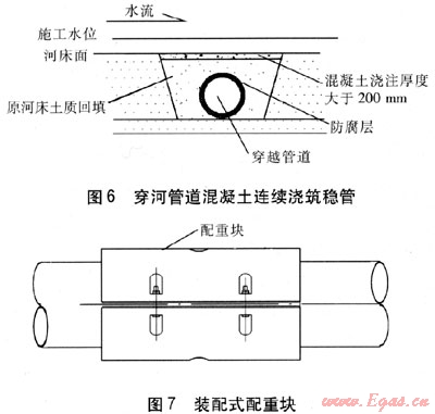 管道往往不可避免地要穿跨越城鎮(zhèn)道路、高速公路、國(guó)道(省道)、鐵路(見(jiàn)圖5)及江河或其他特殊設(shè)施。對(duì)于穿跨越管道,由于管道運(yùn)行后難以再實(shí)施檢修工作或檢修工作難度大、費(fèi)用高,因此管道穿跨越施工及措施的好壞直接影響著管道穿跨越的質(zhì)量。穿跨越河流段的管道(見(jiàn)圖6),當(dāng)河床受水流沖刷而使其覆土厚度逐漸減小,將可能造成管道懸空。對(duì)于通航河道,如果進(jìn)行疏?;虼皰佸^時(shí),將對(duì)管道構(gòu)成危害。如果管道配重(見(jiàn)圖7)不足,將會(huì)造成管道的上浮而破壞。因此,應(yīng)特別注意穿越深度及穿越層的穩(wěn)定,同時(shí)應(yīng)修建適當(dāng)?shù)臉?biāo)志物、護(hù)岸、護(hù)底、配重塊等保護(hù)設(shè)施,使管道免于破壞。