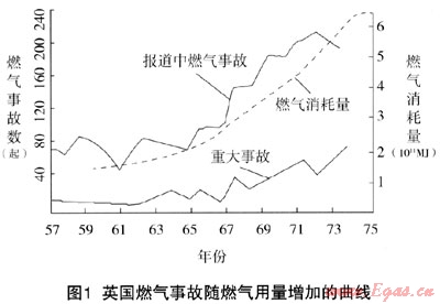 隨著我國城鎮(zhèn)燃?xì)馐褂玫钠占?,室?nèi)燃?xì)馐鹿室矊映霾桓F,如何減少室內(nèi)燃?xì)馐鹿蕩淼纳鼈拓?cái)產(chǎn)損失是人們持續(xù)關(guān)注的焦點(diǎn)。統(tǒng)計(jì)表明,燃?xì)獗ǖ氖鹿蕯?shù)與燃?xì)庥脩艉腿細(xì)庀膸缀醭烧?,如圖1所示為英國燃?xì)馐鹿实慕y(tǒng)計(jì)。為了維護(hù)燃?xì)饪蛻舻纳?cái)產(chǎn)安全,有必要對事故的成因、規(guī)律及危害進(jìn)行分析以找出相應(yīng)的防范措施。本文就是探索這類事故產(chǎn)生和發(fā)展的規(guī)律,提出有效的預(yù)防和控制措施,解決目前燃?xì)庑袠I(yè)亟待解決的居民用戶安全問題,因此具有重大的社會經(jīng)濟(jì)效益。