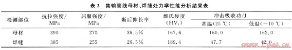 在四川某集輸管線上截取試樣分別按照國家標(biāo)準(zhǔn)進(jìn)行理化性能試驗(yàn),管線母材和焊縫的化學(xué)成分、力學(xué)性能綜合測試結(jié)果見表1、2。