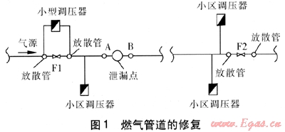 修復(fù)作業(yè)開(kāi)始時(shí),派人在各調(diào)壓站監(jiān)測(cè)各小區(qū)中、低壓管網(wǎng)壓力,當(dāng)確定各小區(qū)均無(wú)大量用氣后,關(guān)閉泄漏點(diǎn)兩側(cè)的閥門(mén)F1、F2。在閥門(mén)F1、F2關(guān)閉后、放散燃?xì)馇?,將各小區(qū)低壓壓力提高到2940Pa后,關(guān)閉小區(qū)調(diào)壓器,以滿(mǎn)足少數(shù)用戶(hù)的用氣需求(如果作業(yè)時(shí)小區(qū)的低壓壓力低于784Pa,可打開(kāi)小區(qū)調(diào)壓器旁通供氣)。在F2閥門(mén)左側(cè)的放散管進(jìn)行放散,將中壓壓力降至784~980Pa。壓力降到搶修工作壓力后,開(kāi)始作業(yè)。秦皇島市燃?xì)夤艿来蟛糠质堑冉孛骅T鐵直管道,接口采用錐套式柔性接口,因此不論泄漏點(diǎn)是位于管道接口還是管道本身,要想修復(fù)均需切掉一段泄漏點(diǎn)所在的管道(長(zhǎng)約1m),更換新管道,重新使用連接套連接。切斷管道前,拆掉工作孔A、B上的閥門(mén),塞入阻氣袋(防止切斷管道時(shí)放空燃?xì)猓烊肟諝猱a(chǎn)生爆炸)。然后切斷管道并更換新管道,進(jìn)行接口連接等工作。接口連接完畢,撤出工作孔A處的阻氣袋,通過(guò)F1處的小型調(diào)壓器輸送燃?xì)?,用燃?xì)庵脫Q新管道內(nèi)的空氣。置換完成后,撤掉工作孔B處的阻氣袋,稍開(kāi)閥門(mén)F1,使管內(nèi)壓力緩慢上升,達(dá)到運(yùn)行壓力后,對(duì)接口進(jìn)行查漏。查漏合格則完全打開(kāi)閥門(mén)F1、F2。在完全開(kāi)啟閥門(mén)F1、F2前,各調(diào)壓站人員關(guān)閉小區(qū)調(diào)壓器旁通閥,準(zhǔn)備恢復(fù)正常供氣。另外,如果小區(qū)壓力低于588Pa,且搶修發(fā)生在夜間,為防止出現(xiàn)用戶(hù)室內(nèi)事故,應(yīng)先關(guān)閉調(diào)壓器,在清晨用氣前進(jìn)行恢復(fù)供氣的宣傳,才能開(kāi)啟調(diào)壓器進(jìn)行供氣;如果小區(qū)壓力大于588Pa,可把壓力直接調(diào)整到正常壓力恢復(fù)供氣。以上工作完成后,回填作業(yè)坑,清理現(xiàn)場(chǎng),作業(yè)結(jié)束。
