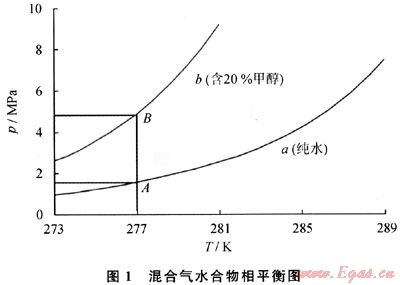 當(dāng)介質(zhì)中加入一種化學(xué)劑時(shí),天然氣水合物形成的平衡條件就會(huì)改變,這就是熱力學(xué)抑制劑的作用機(jī)理。熱力學(xué)抑制劑可以使介質(zhì)的相平衡曲線上移,如圖1所示,同一混合氣在加入20%的甲醇后,其生成天然氣水合物的平衡曲線就由a線升高到b線,即當(dāng)管道的運(yùn)行溫度為277K時(shí),加入甲醇后,管道中當(dāng)壓力高于4.85MPa時(shí)才會(huì)生成天然氣水合物。天然氣水合物生成壓力遠(yuǎn)高于加入甲醇前的1.55MPa,這對(duì)于天然氣的輸送非常有利。目前2種最主要的熱力學(xué)抑制劑甲醇和乙二醇得到了廣泛應(yīng)用。相對(duì)來(lái)說(shuō),甲醇用得更廣泛,可以用于油氣混輸管道和天然氣管道2種系統(tǒng),且對(duì)含鹽高的系統(tǒng)效果更好;而乙二醇一般用于含水非常少的天然氣輸送系統(tǒng)中。可以說(shuō)熱力學(xué)抑制已經(jīng)是目前石油天然氣工業(yè)最主要的天然氣水合物防治手段。